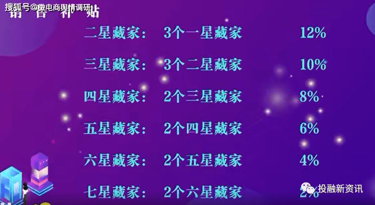 一星藏家:直接分享3个有效账户,且参拍总金额达到三万元以上可升级一星藏家,一星藏家可获得的团队分红收益为团队总拍卖佣金2%的16%。 二星藏家:团队拥有3个一星藏家可升级为二星藏家,二星藏家可获得的团队分红收益为团队总拍卖佣金2%的12%。 三星藏家:团队拥有3个二星藏家可升级为三星藏家,三星藏家可获得的团队分红收益为团队总拍卖佣金2%的10%。 四星藏家:团队拥有2个三星藏家可升级为四星藏家,四星藏家可获得的团队分红收益为团队总拍卖佣金2%的8%。 五星藏家:团队拥有2个四星藏家可升级为五星藏家,五星藏家可获得的团队分红收益为团队总拍卖佣金2%的6%。 六星藏家:团队拥有2个五星藏家可升级为六星藏家,六星藏家可获得的团队分红收益为团队总拍卖佣金2%的4%。 七星藏家:团队拥有2个六星藏家可升级为七星藏家,七星藏家可获得的团队分红收益为团队总拍卖佣金2%的2%。