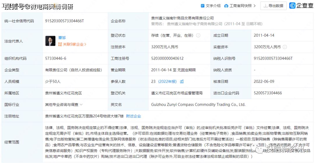 图片来源:企查查 据企查查显示,贵州遵义指南针商品交易有限责任公司是贵州省第一家提供大宗农产品现货交易、网上商城、现货交易等服务的电子商务公司,成立于2011年4月14日 ,位于贵州省遵义市红花岗区万里路204号物资大楼7楼,注册与实缴资本均是3200万,法人代表覃邹。