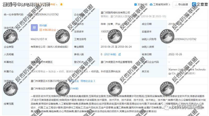 图片来源:企查查 据企查查显示,厦门邻路网络科技有限公司成立于2018年6月25日,在2018年6月至2022年10月期间的公司名称为厦门月读乐火贸易有限公司,位于厦门市海沧区沧翔路89号201室,注册资本1000万,实缴0元,法人代表邢代朝任执行董事、经理,持股95%,李学峰任监事,持股5%。