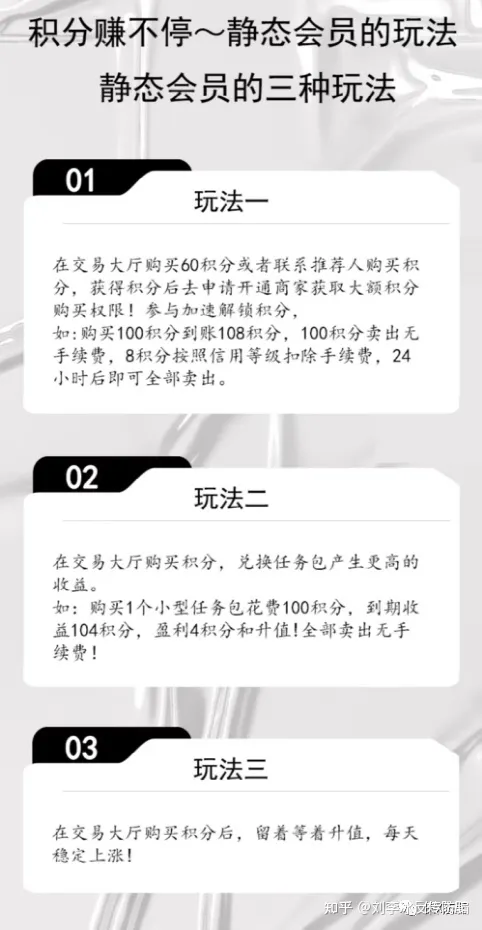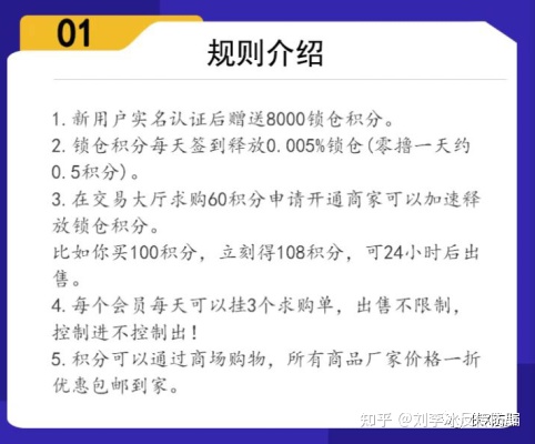 据壹鑫商城推广客服提供的资料显示如下: 1、新用户实名认证后赠送8000锁仓积分(8000锁仓积分属于冻结状态); 2、锁仓积分每天签到可以释放0.005%锁仓(零撸一天大约0.5积分); 3、在交易大厅求购60积分申请开通商家可以加速释放锁仓积分(比如买100积分,可以获得108积分,24小时后可以出售); 4、每个会员每天可以挂三个求购单,出售不限制,控制进不控制出(每个会员每天可以购买三次积分,积分售卖没有限制); 5、积分可以通过平台商场购物,所有商品厂家价格一折优惠包邮到家(目前平台商场只有虚拟任务包可以购买,目前还没有实际商品)。