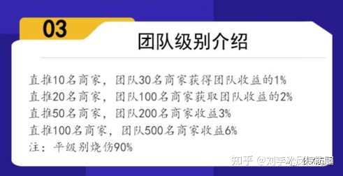 如何获取积分:因目前该平台没有大量释放积分,商户只能通过平台商城求购,但是每天只能购买三次,市场需求量大,明显求大于供。用户还可以通过拉人头方式来获得积分,直推一个商户可获得60积分(平台扶持50积分?直推商户获得奖励10积分)。 团队级别介绍: 1、直推10名商家,团队拥有30名商家可获得团队收益的1%; 2、直推20名商家,团队拥有100名商家可获得团队收益的2%; 3、直推50名商家,团队拥有200名商家可获得团队收益的3%; 4、直推100名商家,团队拥有500名商家可获得团队收益的6%。