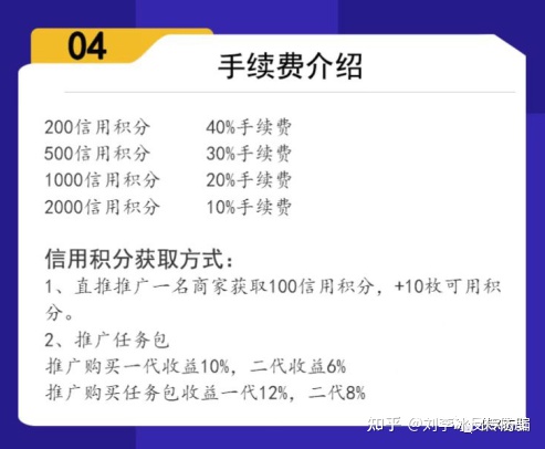 交易手续费介绍: 200信用积分=40%手续费; 500信用积分=30%手续费; 1000信用积分=20%手续费; 2000信用积分=10%手续费。 信用积分获冉式: 1、直推一名商家可获得100信用积分?10可用积分; 2、推广任务包: ①、推广任务包可获得一代收益10%,二代收益6%; ②、推广商户购买任务包可获得一代收益12%,二代收益8%。