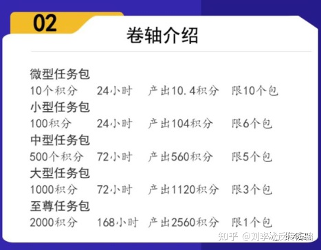 卷轴介绍: 1、微型任务包:10个积分可以购买一个微型任务包,购买24小时后可产出10.4积分,单个会员每日限购10个微型任务包; 2、小型任务包:100个积分可以购买一个小型任务包,购买24小时后可产出104积分,单个会员每日限购6个小型任务包; 3、中型任务包:500个积分可以购买一个中型任务包,购买72小时后可产出560积分,单个会员每日限购5个中型任务包; 4、大型任务包:1000积分可以购买一个大型任务包,购买72小时后可产出1120积分,单个会员每日限购3个大型任务包; 5、至尊任务包:2000积分可以购买一个至尊任务包,购买168小时后可产出2560积分,单个会员每日限购1个至尊任务包。