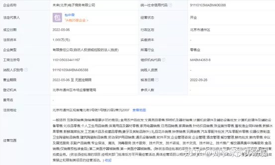 公司背景,最强风口? 经查,壹鑫商城的公司主体为未来(北京)电子商务有限公司,成立于2022年5月6日,法定代表人包中雪,股东为北京中辉蒙医医院管理有限公司,监事李子轩,执行董事、经理为包中雪,注册资本1000万元整,实缴未知,参保人数0人。这里值得注意的是该公司股东北京中辉蒙医医院管理有限公司,经查,北京中辉蒙医医院管理有限公司,成立于2020年12月25日,法人为包中雪,股东有包中雪、朱亚兰,注册资本5000万元整,实缴未知,参保人数0人。
