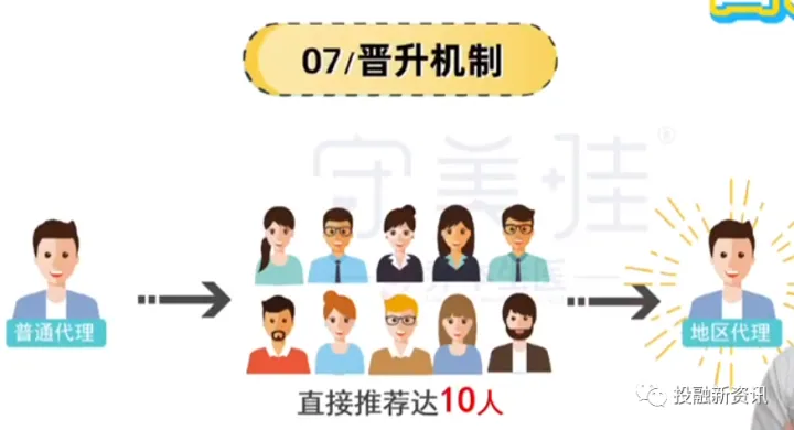 晋升机制:普通代理直推10人加入守美佳代理就可以升级为地区代理。