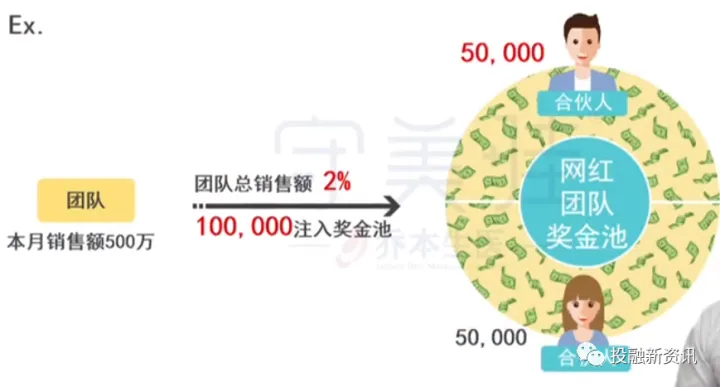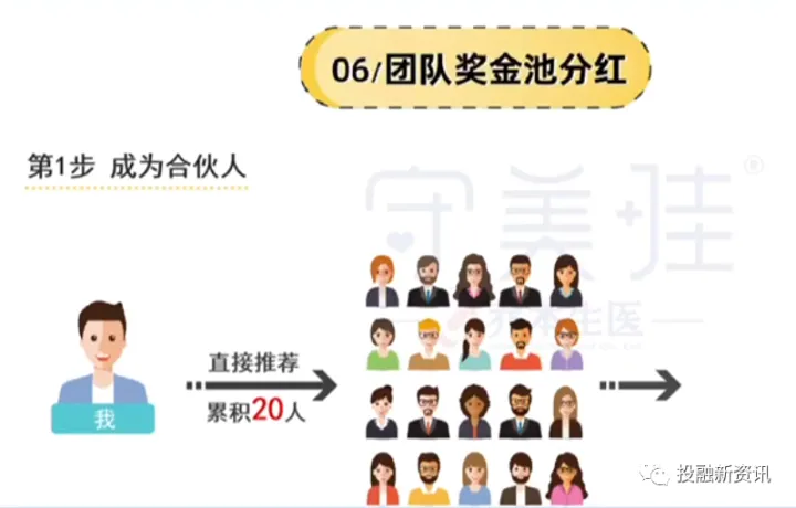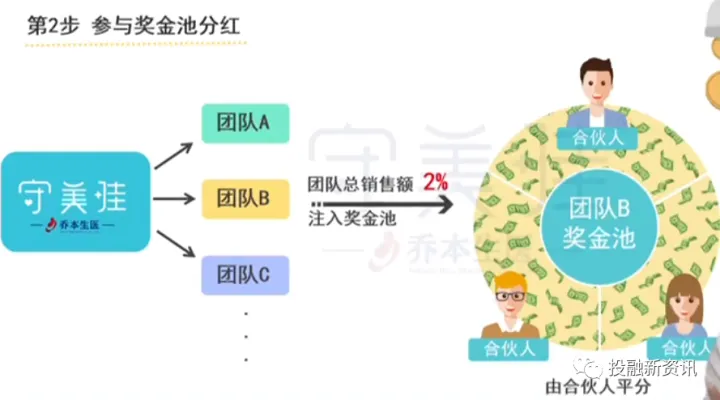 团队奖金池分红: 要想获得这个奖金,需要成为守美佳的合伙人,累积推荐20位代理就能成为守美佳的合伙人。 成为合伙人之后,可获得整个团队的2%的分红,若是该月整个团队的销售额达到500万,公司就会拨比2%到奖金池,合伙人就能参与分红。