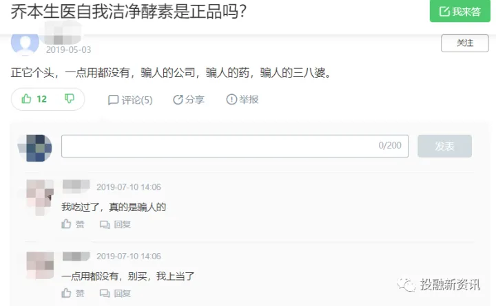 据乔本酵素的食用方法介绍,该产品能完美解决便秘、水肿、打嗝、胀气、口臭、解酒等问题困扰,还能保持肠道清洁和身材苗条。但经投融新资讯查询,乔本生医自我洁净酵素产品却被消费者质疑是没用的产品: