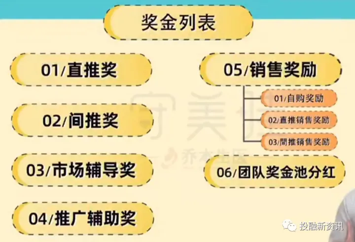 守美佳的奖金共分为六种:直推奖、间推奖、市场辅导奖、推广辅助奖、销售奖、团队奖金池分红。