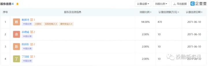 图片来源:企查查 据企查查的股东信息图显示,守美佳(厦门)贸易有限公司最大的股东是其法人代表赖屏鸿,持股94%,余德威、陈妍彤、丁冠铭各持股2%。