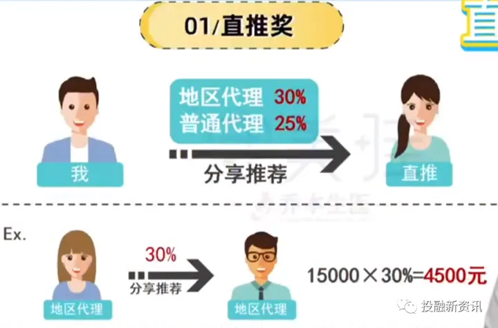直推奖:地区代理享受30%的直推奖,普通代理享受25%的直推奖。地区代理每推荐一个地区代理可获得4500元的直推奖。