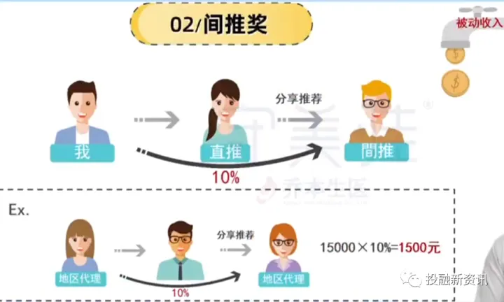 间推奖:10%,若你的下线每推广一个地区代理,你可获得15000元的10%,也就是1500元。