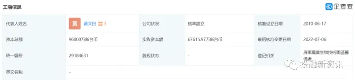图片来源:企查查 据企查查显示,乔本生医股份有限公司成立于2010年6月17日,公司资本总额96000万新台币,实收资本额67615.97万新台币,法人代表黄文田。