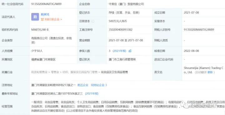 图片来源:企查查 经企查查查询,守美佳(厦门)贸易有限公司成立于2021年7月8日,位于厦门市湖里区枋湖北二路1507号506室之三,注册资本500万,实缴不详,法人代表赖屏。
