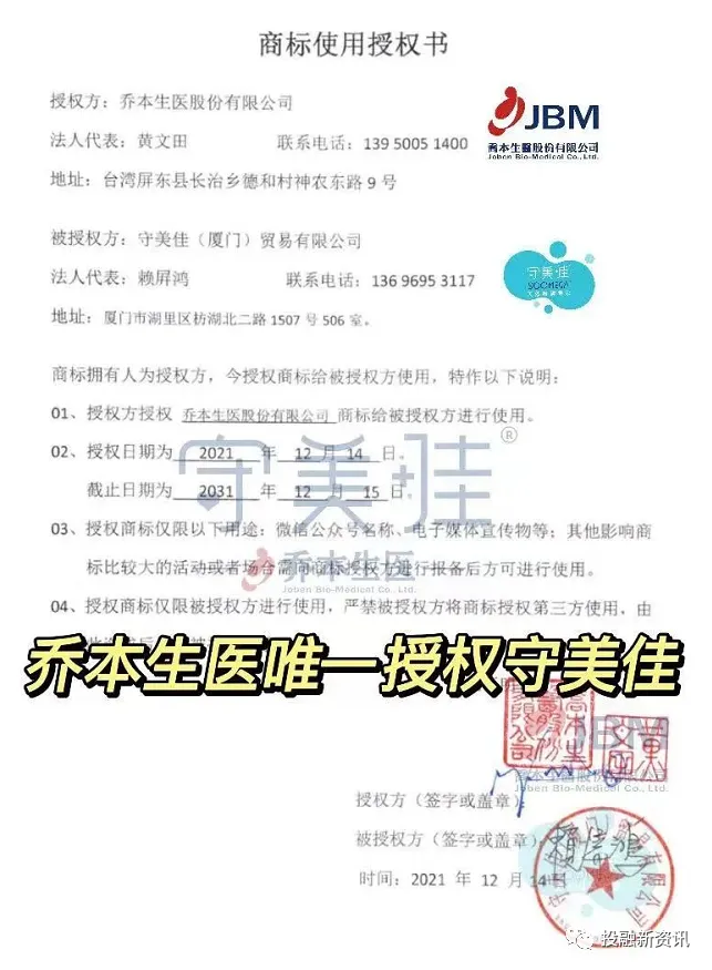 图片来源:守美佳微信公众号 据守美佳微信公众号发布于今年3月份的一则公告显示,守美佳是乔本生医在大陆唯一授权的品牌。