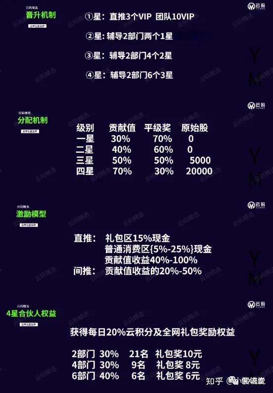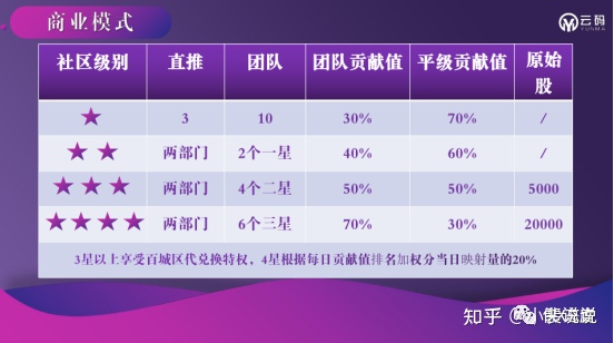 图片来源:该平台推广资料 团队部门社区合伙人权益及奖励: 社区合伙人级别分为一星、二星、三星、四星合伙人。 一星合伙人:直推三个消费者且团队达到10个消费者,可获得30%团队云值?70%平级云值; 二星合伙人:直推两个部门?两个一星,可获得40%团队云值?60%平级云值; 三星合伙人:直推两个部门?四个二星,可获得50%团队云值?50%平级云值?5000原始股; 四星合伙人:直推两个部门?六个三星,可获得70%团队云值?30%平级云值?20000原始股。 (二部门、四部门、六部门是什么意思?简单点说部门可以理解为,到达四星以后,最少是两个部门,之后就可以开始做宽度,每开一条三星合伙人部门,就算一个部门激活,以此类推)。