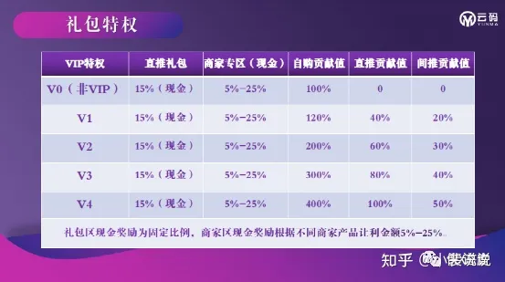 图片来源:该平台推广资料 2、全品类商城区提供给全网消费者,消费者可以自用省钱、分享赚钱,未购买礼包区产品的消费者,商城区分享只有一级现金奖励,没有云值奖励。 接下来再为大家接着介绍购买礼包具体可以获得哪些收益: 礼包区分为V0(非VIP)、V1、V2、V3、V4五种 1、V0(非VIP):直推可获得15%(现金奖励)?100%云值; 2、V1:直推可获得15%(现金奖励)?120%云值?40%直推云值?20%间退云值; 3、V2:直推可获得15%(现金奖励)?200%云值?60%直推云值?30%间退云值; 4、V3:直推可获得15%(现金奖励)?300%云值?80%直推云值?40%间退云值; 5、V4:直推可获得15%(现金奖励)?400%云值?100%直推云值?50%间退云值; 注:每个礼包区只能购买一次。