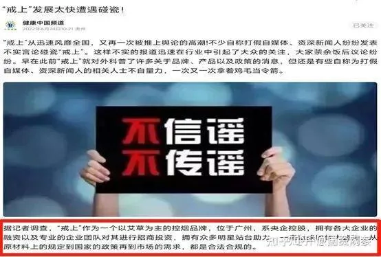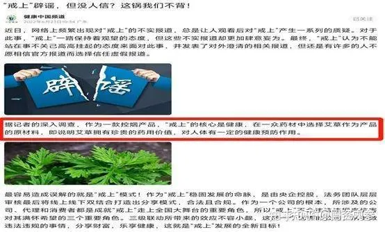 前有中央人民政府的背书,后有央媒舆论加持 观察员注意到在腾讯新闻有个名为降中国频道的账号,该账号乍看貌似央媒,但并未进行媒体认证。从账号简介及发布的文章内容来看,该账号实际就是一个很普通的自媒体号。 在戒上降屡次被曝负面舆情的情况下,降中国频道频繁以记者、记者调查等词汇陈述文章,妄图混淆视听,为戒上降平反。 6月22日、23日、24日,7月6日、12日,降中国频道连续发表戒上艾烟遭遇碰瓷,投资人站台艾草功效引争议、戒上辟谣,但没人信?这锅我们不背!、戒上发展太快遭遇碰瓷、戒上碰瓷黑媒体,监管部门怎么看及 从培训师变投资人,他做了什么?等文章, 在文章中,该账号称:据记者调查,戒上作为以艾草为主的控烟品牌,位于广州,系央企控股……从原材料上的规定到国家的政策再到市场的需求,都是合法合规的。 并称有些自称为打假自媒体、资深新闻人的相关人士不自量力,一次又一次拿着鸡毛当令箭。网络上层出不穷的不实报道,恶意对戒上的一系列抨击,让戒上看见了一个闻所未闻的笑话。