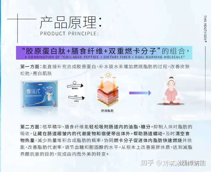 据推广者介绍,其产品原理有二:1.能直接补充合成胶原蛋白、锁水补水增加燃烧脂肪的过程,改善皮肤,两百剪;2.让脂肪快速活跃起来,加速脂肪细胞的更替。平衡食物营养摄入,抑制粮糖份吸收,均衡补充必需能量,减少饥饿感,促进脂肪燃烧,加速机能代谢之功效,达到绿色瘦身,降减,才绝反弹打造易瘦体质的瘦身效果。