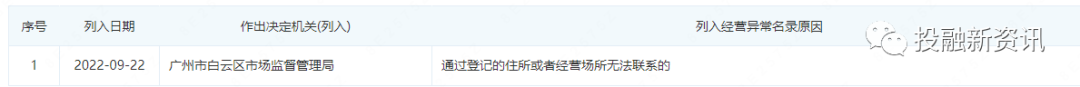 于今年的9月22日,因通过登记的住所或者经营场所无法联系到,被列为经营异常。