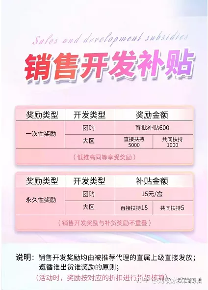 例如:品牌双月出货量达30万盒,共合计市场补贴总额为150万; 大区(100人) 共享补贴150×45%=67.5万,人均奖励6700元 总裁(20人) 共享补贴150×25%=37.5万,人均奖励18750元 合伙人(5人) 共享补贴150×20%=30万 , 人均奖励60000元 运营中心(2人)共享补贴150×10%=15万, 人均奖励75000元 同时还享有销售开发补贴奖励: