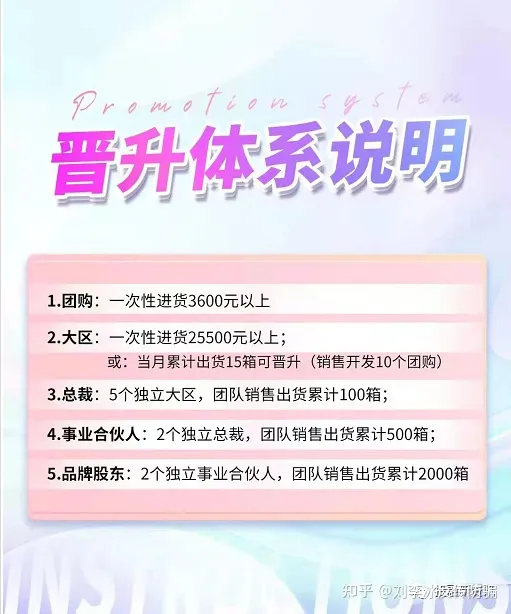 当然足够优秀的话,公司还有更为完善的晋升体系,具体有团购、大区、总裁、事业合伙人以及品牌股东5个层次,具体晋升机制如下: 团购:一次性进货3600元以上 大区:一次性进货25500元以上 或:当月累计出货15箱可晋升(销售开发10个团购) 总裁:5个独立大区,团队销售出货累计100箱 事业合伙人:2个独立总裁,团队销售出货累计500箱 品牌股东:2个独立事业合伙人,团队销售出货累计2000箱