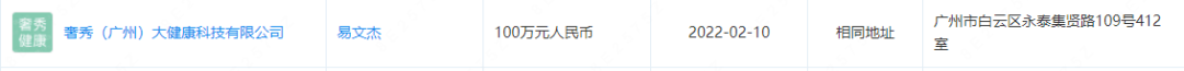 据了解,与之相关联的还有广州瘦嘴儿大降科技有限公司,成立于2021年8月23日,位于广州市白云区永泰集贤路109号412室。注册资本100万人民币,实缴不详,法定代表人同样是黄家洪,该公司的股东一共有三位:黄家洪持股70%为公司大股东,罗夕持股20%任职公司监事,吴海强持股10%。 据企查查提供的资料数据,与其注册地址雷同的还有一家公司:奢秀(广州)大降科技有限公司。