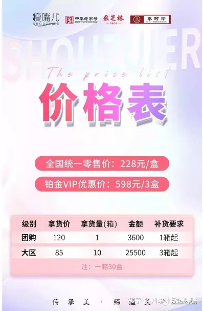 据食品安全法第七十三条也有明确规定:食品广告的内容应当真实合法,不得含有虚假内容,不得涉及疾病预防、治疗功能。显然,上述的十一大功能,就已神话夸大了其产品。 据代理商透露的消息,瘦嘴儿创始人站在代理商的角度,并愿意打造10个年入千万的大团队长以及100个年入百万的团队长,在代理模式利润上做到了全行业最高。 从代理提供的价格表上可以看出,全国统一零售价是228元/盒,598元/3盒就能成为铂金VIP;团购的拿货价是120元,补货要求1箱起(一箱=30盒);大区的拿货价是85元,补货要求是3箱起。