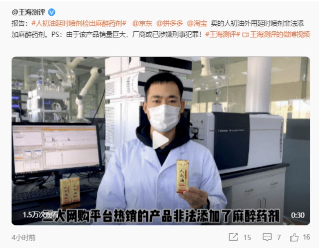 微博称,王海检测在拼多多、京东和淘宝都购买了人初油外用延时剂,经检测确认该产品检出了笨佐卡因、定因两种麻醉药剂,属于非法添加。由于三大网购平台的销量巨大,望该产品的出品方深圳市人初集团、深圳市人初医疗用品有限公司眷主动赔偿消费者并向公安机关投案自首。同时,建议买到该产品的消费者眷停止使用,并向厂家要求退赔。