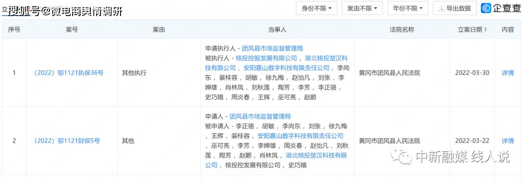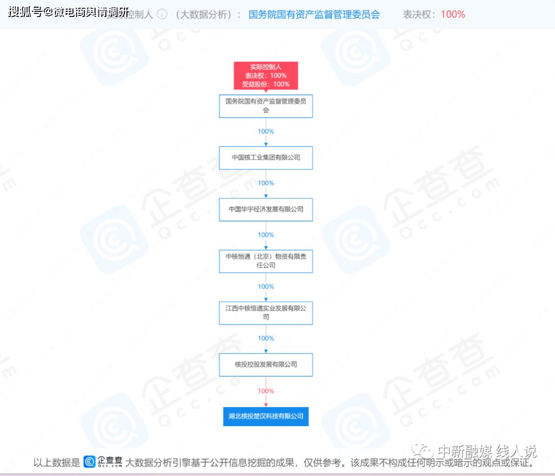 据企查查显示,湖北核投楚汉科技有限公司成立于2021年8月13日,注册资本 为2000万元,章昭担任法人,核投控股发展有限公司100%控股。此外,通过企查查股权关系发现,江西中核恒通实业发展有限公司由中核恒通(北京)物资有限责任公司控股,中核恒通(北京)物资有限责任公司由中国华宇经济发展有限公司控股,中核恒通(北京)物资有限责任公司再由中国核工业集团有限公司控股,中国核工业集团有限公司再由国务院国有资产监督管理委员会控股。 据企查查还显示,2022年3月30日,据(2022)鄂1121执保36号显示,申请执行人团风县市场监督管理局,被执行人核投控股发展有限公司 ,湖北核投楚汉科技有限公司 ,安阳嘉山数字科技有限责任公司 ,李尚东 ,裴桂容 ,胡敏 ,徐九梅 ,赵怡凡 ,刘张 ,李婵雄 ,肖林凤 ,刘秋莲 ,陶芳 ,李芳 ,李正骆 ,史巧娥 ,周炎春 ,王辉 ,巫可亮 ,赵鹏。