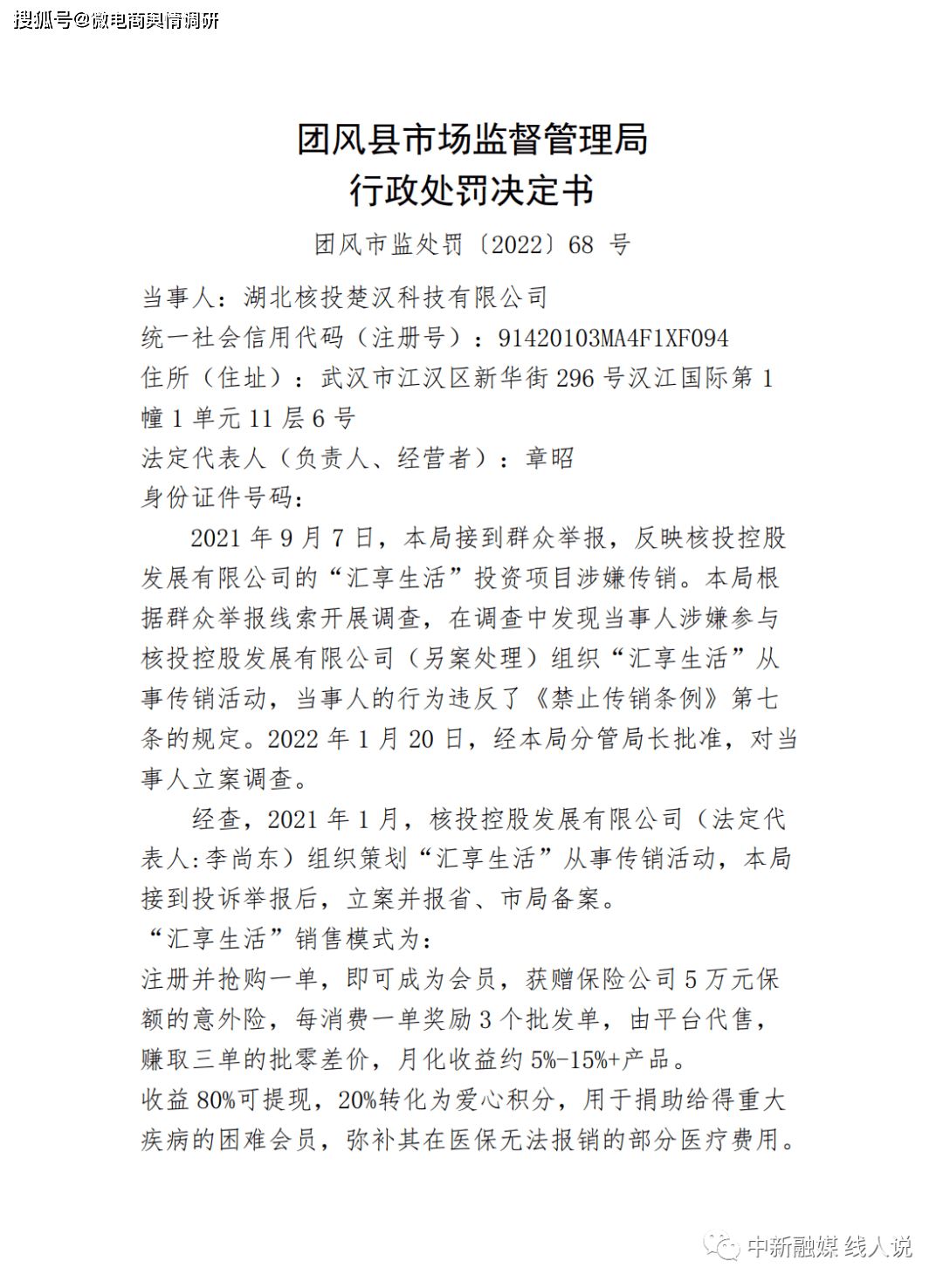 近日,中新融媒发现一则行政处罚决定书,湖北核投楚汉科技有限公司因涉嫌传销行为被团风县市场监督管理局处罚120万元。