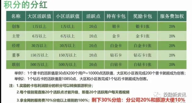 再次,做创业者,带领团队完成一定业绩,进入管理层另可拿工资及分红: 创客:大小区完成各1万积分,直推人数20人,工资5千元/月 主管:大小区完成各6万积分,直推人数20人,工资1万元/月 经理:大小区完成各30万积分,直推人数20人,工资3-5万元/月 董事:大小区完成各150万积分,直推人数20人,工资8-10万元/月 联创:开省级分公司,收入更可观! 那么怎么成为创客呢? 例入:1个普卡的活跃值是50点*200个用户=10000点活跃值,大区和小区各完成200个普卡就能成为创客。或者1个钻石卡的活跃值是10850点,那么大区和小区只需要各完成1个钻石卡也能成为创客。 积分的分红权利: