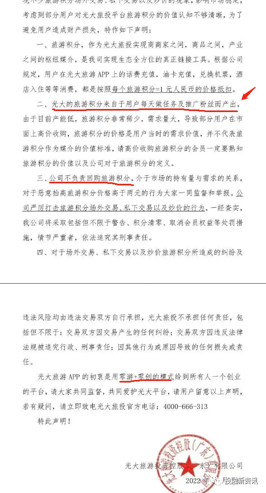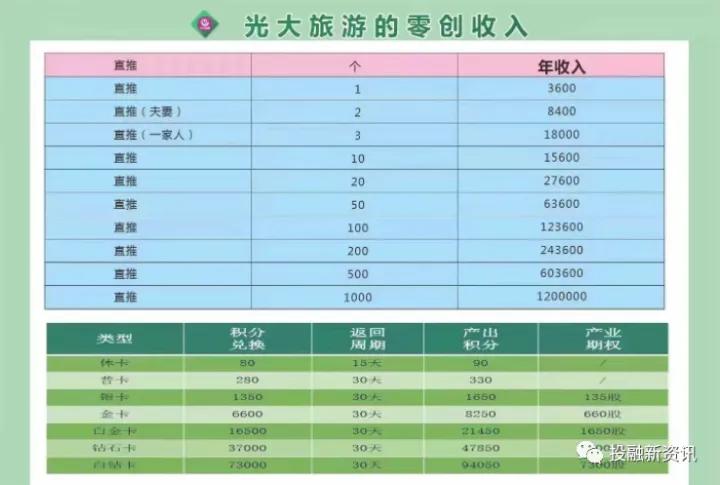 据官方公众号资料显示,光大旅游投资控股(广东)有限公司成立于2014年,旗下控股的广东光大国际旅行社有限公司成立于2011年,是一家经国家旅游局批准,工商局登记注册的合法出境旅游组团社,在业内拥有着良好的品牌形象与客户口碑。 据企查查资料显示,光大旅游投资控股(广东)有限公司成立于2014年11月,法定代表人张长亮,同时他也是广东光大国际旅行社有限公司的法定代表人和股东之一。从股东信息来看,光大旅游投资控股(广东)有限公司的股东有二:京瀚投资(广州)合伙企业(有限合伙)持股82%为大股东,泰邦投资(广州)合伙企业(有限合伙)持股18%为第二股东。据了解,张长亮以最终受益62.18%的股份为最终受益人。 据官网资料显示,三年疫情冲击下,旅游行业进入全面转型升级新阶段,光大旅投引领数字生活,以新旅游,新经济,新动能为发展路线,以文旅创投为业务入口,采取网推+地推+会推全新方式,构建全新的循环生态圈。 据公众号11月10日文,光大旅游APP2.0新版已正式上线,完成线上线下的旅游+多功能生活平台的搭建,全新的零元+零创模式,让更多的人参与到平台中,让更多行业和合作者获得更大价值! 据推广者资料介绍,关于看视频拿奖励主要有以下几步: 新用户通过推荐人提供的二维码扫码注册,人脸实名认证后系统会在卡包里赠送一张普卡,赠送的普卡月总产出330个积分;目前1个旅游积分黑市价值1.8-2.5元,光大APP平台里交易1.4-1.6元。 每日只需登陆看9个广告即可每月静态收入50元一个账号。零撸账号持续将所得积分复投一年,365天后可兑换接近3600元。如果是夫妻两个人,一年的收入就是8400元,一家人直推就有18000元的收入等等。