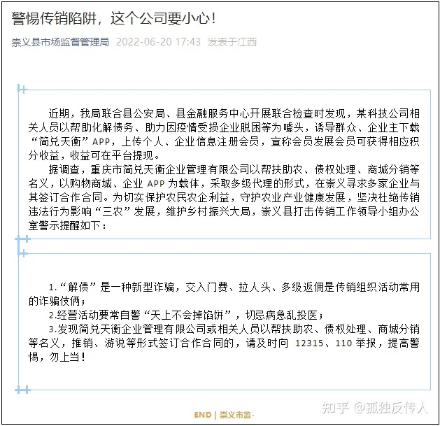 崇义县市场监管局称,近期,该局联合县公安局、县金融服务中心开展联合检查时发现,某科技公司相关人员以帮助化解债务、助力因疫情受损企业脱困等为噱头,诱导群众、企业主下载简兑天衡APP,上传个人、企业信息注册会员,宣称会员发展会员可获得相应积分收益,收益可在平台提现。据调查,重庆市简兑天衡企业管理有限公司以帮扶助农、债权处理、商城分销等名义,以购物商城、企业APP为载体,采揉级代理的形式,在崇义寻求多家企业与其签订合作合同。 中国质量新闻网查询发现,早在2021年11月,有名为传销解救师刘李冰的知乎作者发布了题为揭秘:简兑天衡APP疑是打着解债的旗号从事传销活动的文章,对简兑天衡模式进行分析,最后得出的结论为简兑天衡APP设置多级别代理资格获得不同收益,设置直推奖、间推奖等多种收益奖励,并且以多层次营销模式引诱代理商‘拉人头’,与现行法规相违背。至于该行为是否涉嫌传销,还需等待监管部门最终裁定。 此外,崇义县市场监管局的文章还刊出崇义县打击传销工作领导小组办公室的警示提醒:1.解债是一种新型诈骗,交入门费、拉人头、多级返佣是传销组织活动常用的诈骗伎俩;2.经营活动要常自警天上不会掉馅饼,切忌病急乱投医;3.发现简兑天衡企业管理有限公司或相关人员以帮扶助农、债权处理、商城分销等名义,推销、游说等形式签订合作合同的,请及时向 12315、110 举报,提高警惕,勿上当! 重庆简兑天衡企业管理有限公司官网介绍称,其成立于2021年8月20日,在2021年9月12日由重庆市江津区天衡生态农业发展有限公司全资控股,服务于简兑天衡商城。公开资料显示,该公司法人代表为周培林,注册资本1000万元。