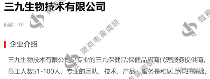但是据企查查显示,三九企业集团旗下控股企业高达三百多个,但并不包含三九生物技术有限公司。调查得知,三九生物技术有限公司只是一个保健品招商代理服务提供商,企业地址是安徽阜阳市颍州区阜阳市颍州路百福大厦三楼,且公司员工也只有100人。
