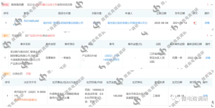据企查查显示,南京同仁堂绿金家园保健品有限公司成立于2012年10月16日,法定代表人为杨福兴,所属行业为批发业,经营范围包含保健用品的研发销售等业务。但是,该公司风险提示不断,曾因该企业自身未履行法定义务被限制高消费,且也曾因作虚假或者引人误解的商业宣传行为及其从属被行政处罚,也因产品责任纠纷被起诉。