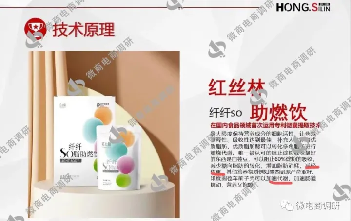 作为红丝林旗下最热销的产品SO脂助燃饮,这款产品定位为国内食品首次运用专利微囊提取技术的产品,宣传可以减轻体重,加速代谢。