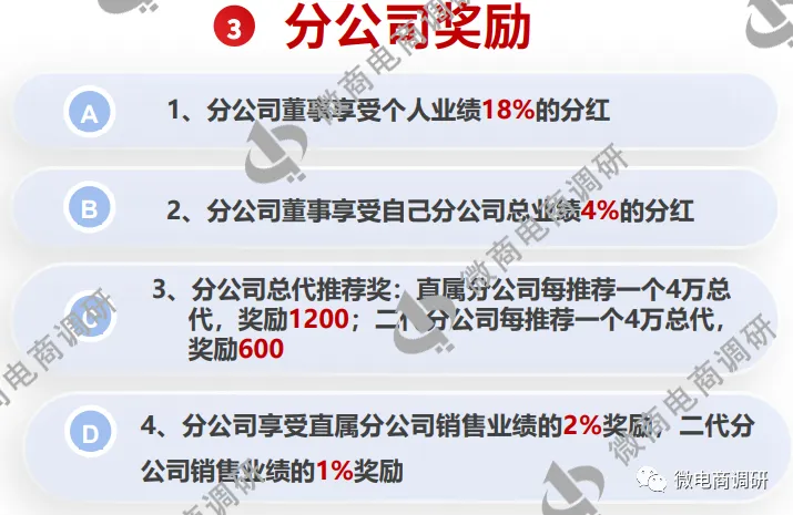 分公司享受个人业绩18%的分红,自己分公司总业绩4%的分红;直属分公司每推荐一个4万总代,奖励1200,二代分公司每推荐一个4万总代,奖励600元;直属分公司销售业绩的2%奖励,二代分公司销售业绩的1%奖励。