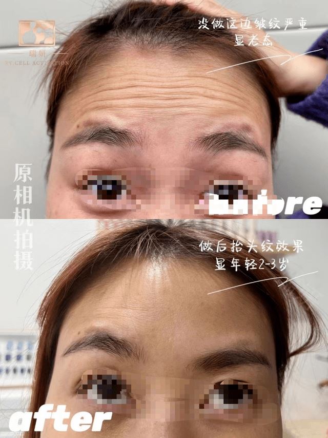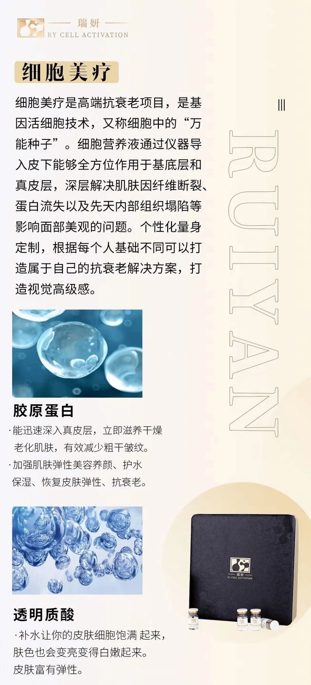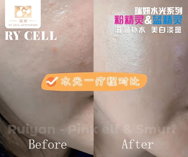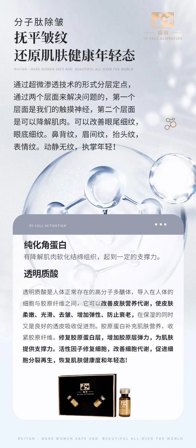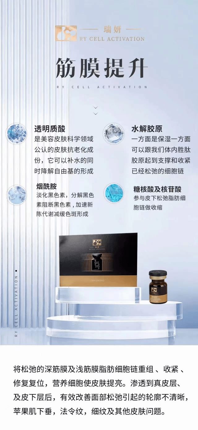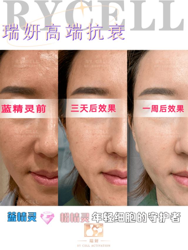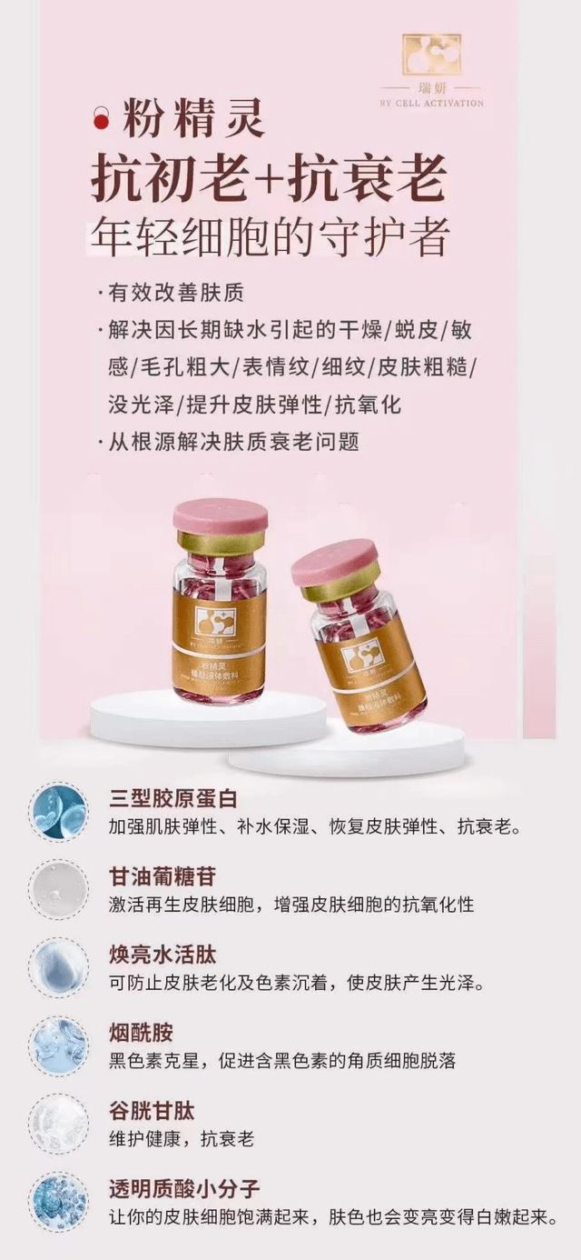 细胞美疗技术宣称是通过基因重组产生的,主要成分是透明质酸,胶原蛋白等,具有激活、修复、再生细胞的功能,是高端抗衰产品;分子肽除皱技术宣称可以解决鱼尾纹、眼底细纹、鼻背纹、眉间川字纹、抬头纹、表情纹,在细胞再生、活性物的作用下,促进细胞裂变、再生、形成纳米级蛋白凝胶并且修复弹力纤维,从而抚平皱纹,还原剪降、年轻态。 筋膜提升技术宣称是将松弛的浅筋膜脂肪细胞链,重组、修复、收紧,通过营养细胞使皮肤提亮,收紧,透过于真皮层、皮下层操作后,能有效改善面部松弛、细纹等其他皮肤问题;外泌体细胞液技术宣传具有抗衰老、保湿、祛皱、紧致祛痘、淡斑等功能。 粉蓝精灵产品宣称对抗衰老具有有效改善肤质,解决因长期缺水引起的干燥、脱皮、敏感、毛孔粗大、表情纹、细纹、皮肤粗糙、没光泽,提升皮肤弹性、抗氧化等功能,能从根源解决肤质衰老问题。瑞妍代理商称其产品所用的技术对抗衰老有奇效,针对这几种抗衰产品的真实性,代理商还分享了很多案例: