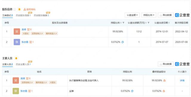 微商电商调研发现,满愿瑞妍的运营公司实际上是杭州奢媄细胞医美科技有限公司,该公司成立于2020年7月8日,注册资本为1313万元,法定代表人为吴辉。该公司由吴辉控股99.9238%担任执行董事兼总经理,同时也是实际控制人和最终受益人,张志霞持股0.0762%担任监事。