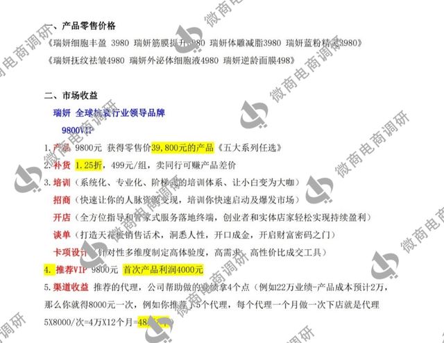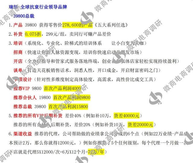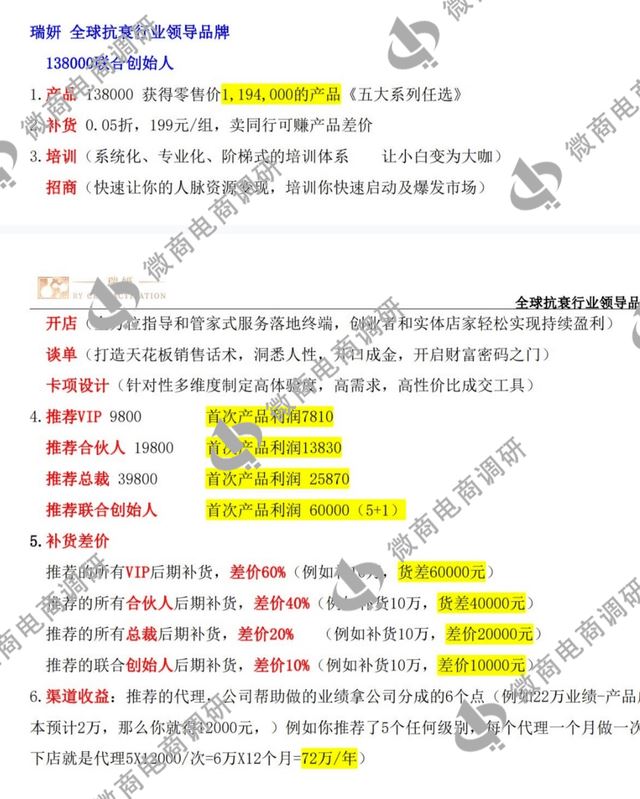 零售价格:瑞妍细胞丰盈、筋膜提升、体雕减脂、蓝粉精灵类产品的零售价都为3980元每盒;瑞妍抚纹祛皱、瑞妍外泌体细胞液产品的零售价为4980每盒;瑞妍逆龄面膜零售价为498元每盒。代理商在公司规定的零售价基础上还可自行定价,上不封顶。 VIP:入门费为9800元,获得零售价39800元的产品,后期补货价格为499元/组;推荐一名VIP获得4000元返费;推荐的代理,获得其每月业绩分红的4%,例如:推荐的代理当月业绩为12万元,产品成本2万元,可获得(12万-2万)×4%=4000元分红,以此类推。 合伙人:入门费为19800元,获得零售价119400元的产品,后期补货价格为399元/组;推荐一名VIP获得4000元返费,推荐一名合伙人获得9800元返费;推荐的所有VIP,可获得其后期补货20%的差价收益;推荐的代理,获得其每月业绩分红的5%。 总裁:入门费为39800元,获得零售价278600元的产品,后期补货价格为299元/组;推荐一名VIP获得4000元返费,推荐一名合伙人获得9800元返费;推荐一名总裁获得15800元返费;推荐的VIP,可获得其后期补货40%的差价收益,推荐的合伙人,可获得其后期补货20%的差价收益;推荐任何级别的代理,获得其每月业绩分红的6%。 联合创始人:入门费为138000元,获得零售价1194000元的产品,后期补货价为199元/组;推荐一名VIP获得4000元返费,推荐一名合伙人获得9800元返费;推荐一名总裁获得15800元返费,推荐一名联合创始人获得60000元返费;推荐的VIP,可获得其后期补货60%的差价收益,推荐的合伙人,可获得其后期补货40%的差价收益,推荐的总裁,可获得其后期补货20%的差价收益,推荐的联合创始人,可获得其后期补货10%的差价收益;推荐任何级别的代理,获得其每月业绩分红的6%。 归根结底,满愿瑞妍属于靠不断推广发展人员形成团队,获得差价收益和业绩分红,推荐的人越多,获得的收益也就越大;要求消费者购买产品获得代理资格收取入门费;设置推荐奖励、差价奖励引诱代理们通过推广人员使其购买产品成为代理来获取利益,涉嫌拉人头;满愿瑞妍这种入门费拉人头模式明显涉嫌违法违规。 禁止传销条例第二条规定:本条例所称传销,是指组织者或者经营者发展人员,通过对被发展人员以其直接或者间接发展的人员数量或者销售业绩为依据计算和给付报酬,或者要求被发展人员以缴纳一定费用为条件取得加入资格等方式牟惹法利益,扰乱经济秩序,影响社会稳定的行为。 该条例第七条将上述定义分解为如下三种类型:第一,拉人头,即组织者或者经营者通过发展人员,要求被发展人员发展其他人员加入,对发展的人员以其直接或者间接滚动发展的人员数量为依据计算和给付报酬,牟惹法利益的;第二,入门费,即组织者或者经营者通过发展人员,要求被发展人员交纳费用或者以认购商品等方式变相交纳费用,取得加入或者发展其他人员加入的资格,牟惹法利益的;第三,团队计酬,即组织者或者经营者通过发展人员,要求被发展人员发展其他人员加入,形成上下线关系,并以下线的销售业绩为依据计算和给付上线报酬,牟惹法利益的。 后记 满愿瑞妍为了吸引消费者购买产品和投资,以瑞士进口、高端抗衰为噱头,涉嫌欺骗消费者,其入门费拉人头的代理模式也涉嫌违法违规。面对鱼龙混杂的医美抗衰市场,微商电商调研建议消费者,要充分了解产品说明,对自身需求进行理性分析严肃对待。 至于以让全球女性安全变美、帮助千万人成功创业、成就亿万事业梦想为宗旨的满愿集团在今后会如何发展?围绕相关产品出现的问题能否得到经营方的重视和整改?对此,微商电商调研将持续关注。 |