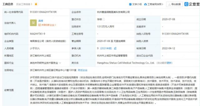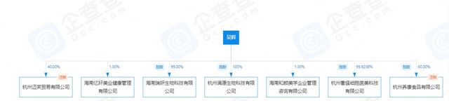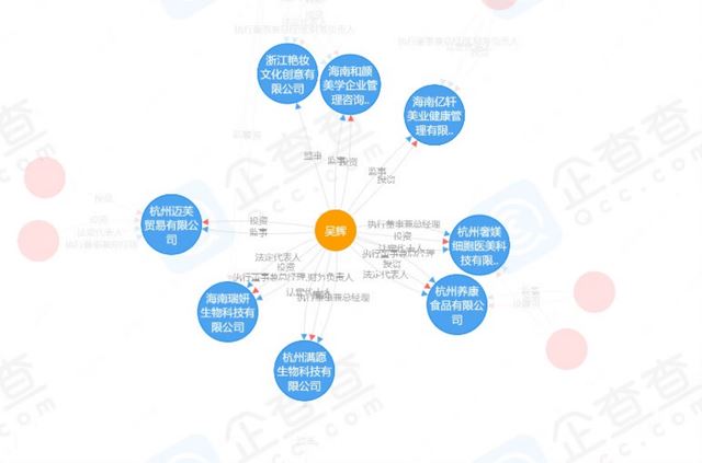 企查查APP显示,吴辉共和8家公司有关,他不仅同时担任杭州满愿生物科技有限公司、海南瑞妍生物科技有限公司、杭州奢姨细胞医美科技有限公司、杭州养康食品有限公司4家公司的法定代表人;还参股了海南和颜美学企业管理咨询有限公司、海南亿轩美业降管理有限公司、杭州迈芙贸易有限公司,并在浙江艳妆文化创意有限公司担任监事,其中杭州迈芙贸易有限公司、杭州养康食品有限公司已被注销。