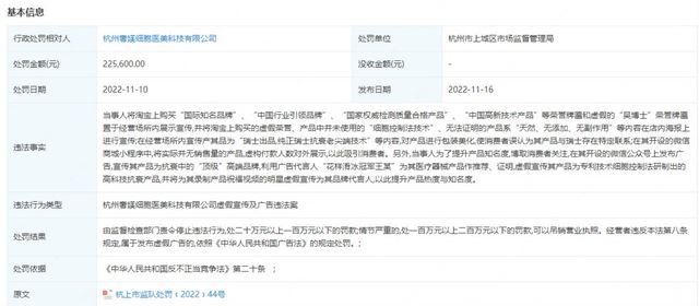值得注意的是,2022年11月10日,杭州奢媄细胞医美科技有限公司曾因网购荣誉牌匾,以瑞士出品等字眼虚假包装产品误导消费者,甚至利用明星祝福视频虚假宣传等被杭州市上城区市场监督管理局处罚225600元。