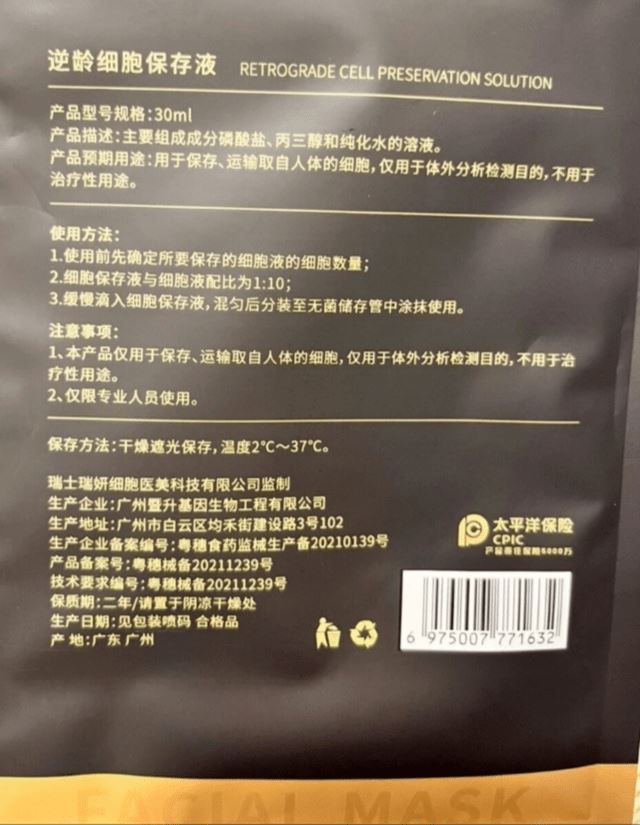 瑞妍产品外包装显示,逆龄细胞保存液是由广州暨升基因生物工程有限公司生产,产品备案号为粤穗械备20211239,属于医疗器械产品。很明显,满愿瑞妍打着瑞士品牌的名号其实是中国品牌,以此来提高档次、哄抬价格获取高利润。在2022年其运营公司因在经营场所内宣传其产品为瑞士出品,纯正瑞士抗衰老尖端技术等内容,对产品进行包装美化,使消费者误认为其产品与瑞士存在特定联系等虚假宣传已被杭州市市场监督管理局处罚,却仍未整改。