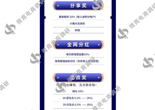 具体奖励包括:第一项,分享奖,即报单额的10%(收入进积分账户),小推大无烧伤,秒结。 第二项,全网分红,每天新增营业额的15%按贡献值加权分红。 第三项,见点奖,该项奖励的特征是单区也赚钱,见点就收钱,拨比10%,详见下图:
