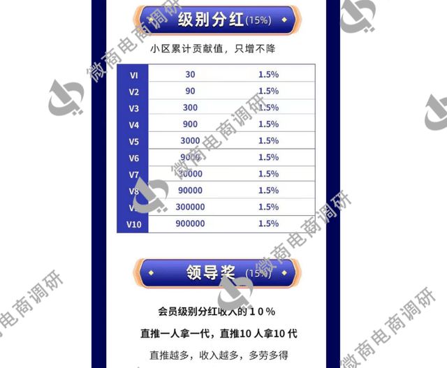 第四项,级别分红,小区累计贡献值,只增不降,级别从V1到V10,一共有10个级别。 第五项,领导奖,会员级别分红收入的10%,直推一人拿一代,直推10人拿10代,直推越多,收入越多,多劳多得。