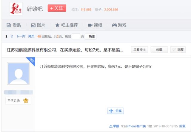 原始股权?争议不断 关于江苏领航能源这些年来的发展,在盱眙县当地已颇具争议。在盱眙贴吧上,已有不少网友反馈领航能源发行原始股的问题,很多人都感觉自己上当受骗了。