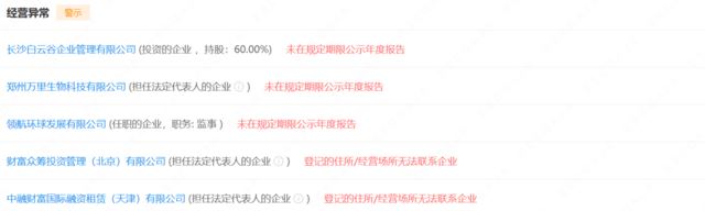 据企查查显示,目前与朱先帅有所关联的企业众多,其中的郑州万里生物科技有限公司、长沙白云谷企业管理有限公司已被监管部门列入到严重违法失信企业名单。