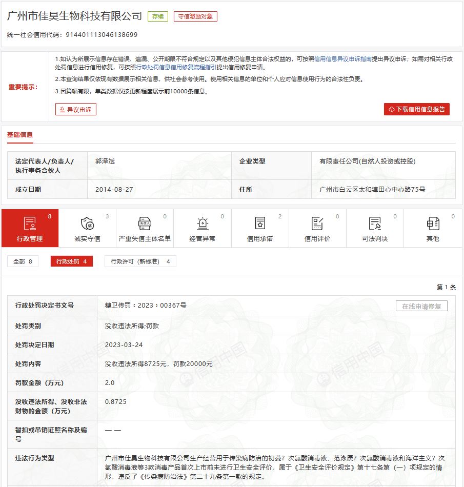 日前,信用中国显示,广州市佳昊生物科技有限公司(简称:佳昊生物)于2023年3月24日因违反传染怖治法,被广州市卫生降委员会处罚。具体违法事实如下: