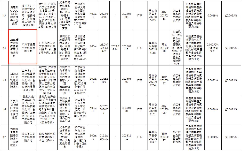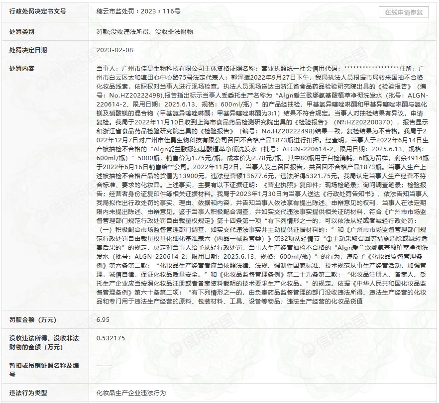 据国家药监局通报的检验结果显示,Algn爱兰歌娜氨基酸植萃净彻洗发水中甲基氯异噻唑啉酮和甲基异噻唑啉酮与氯化镁及硝酸镁的混合物(甲基氯异噻唑啉酮:甲基异噻唑啉酮为3:1)结果不符合规定。根据复检后的结果显示为0.00252%,而规定要务为≤0.0015%。该检验结果初检为浙江省食品药品检验研究院,复检为上海市食品药品检验研究院。通报要求对涉事企业立案调查,责令企业整改,对违法行为依法查处。2月8日,佳昊生物因生产经营不符合标准的化妆品,被广州市白云区市场监督管理局罚没6.95万元。