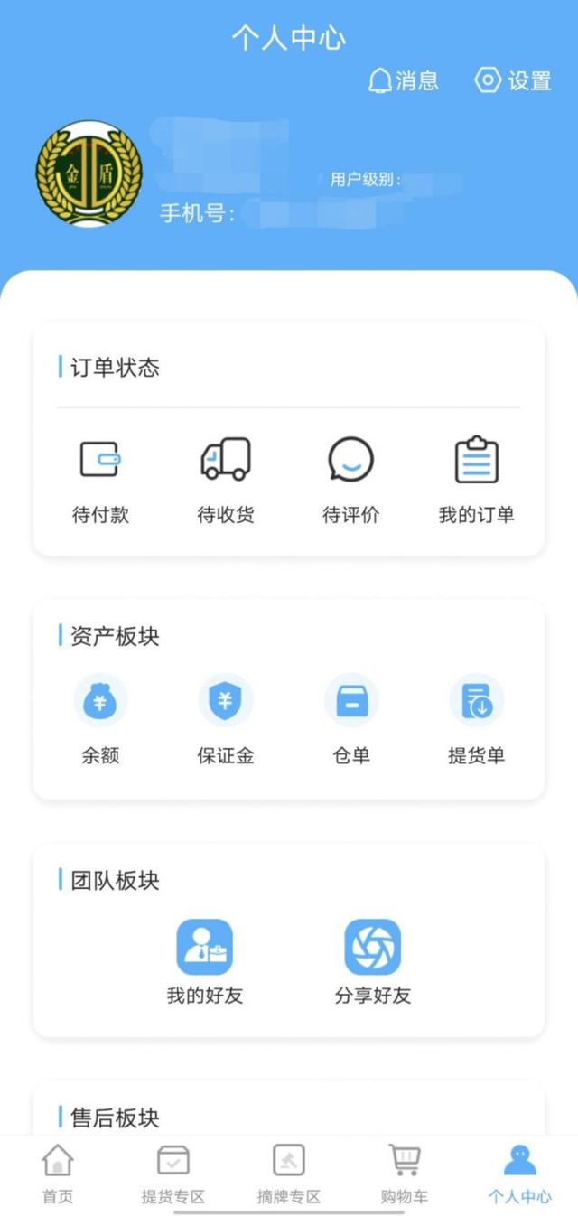 用户通过推广人员分享的二维码可下载金盾供应链。金盾供应链APP有个人中心、摘牌专区和提货专区。个人中心有资产板块,余额、保证金、仓单、提货单;团队板块可以分享好友,获得分享收益,提货专区可以用提货单提货兑换商品。但进入提货专区却看到里面的商品价格都远高出市场价。